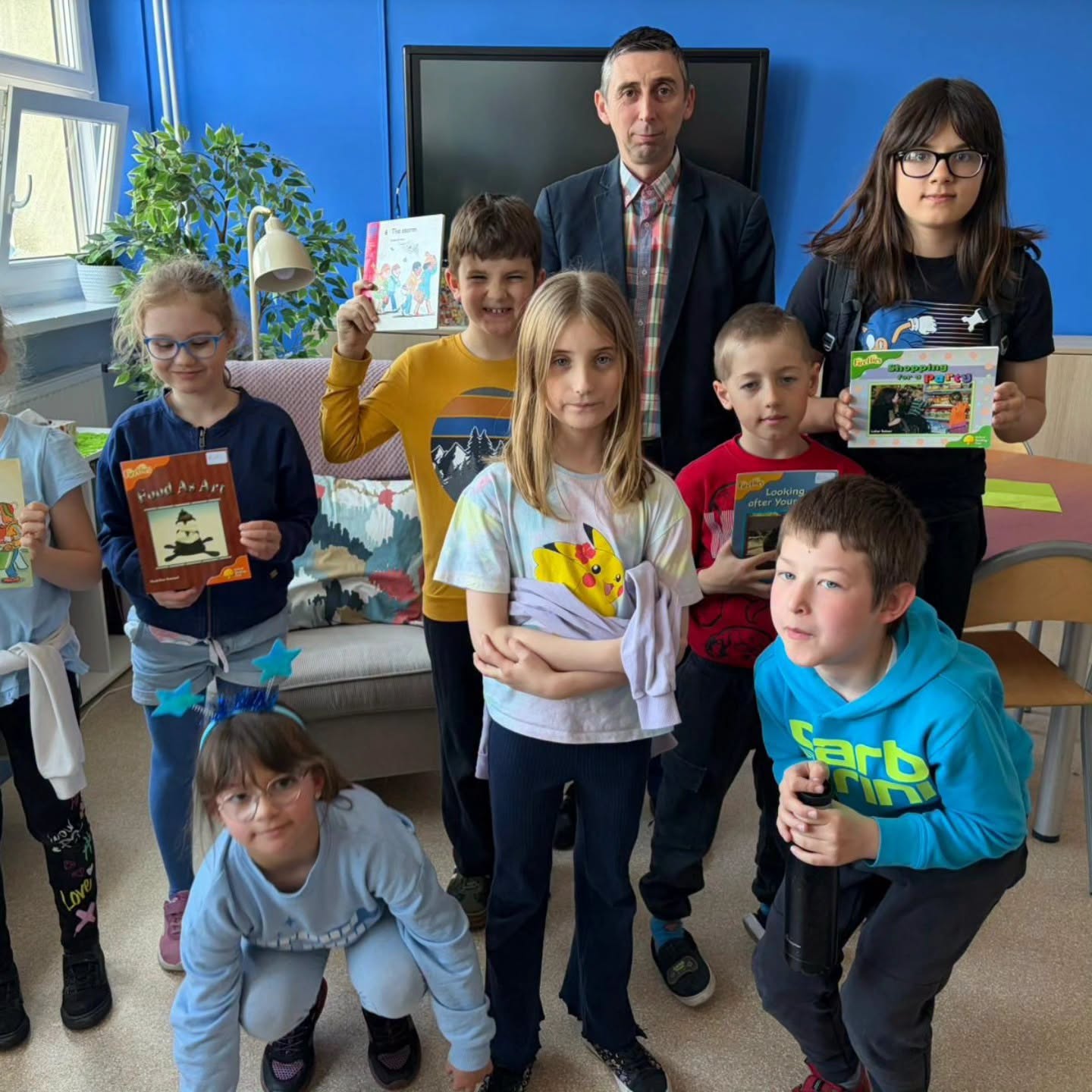 Prezentowane utwory opowiadały o tym, jak troszczyć się o zwierzęta, dlatego spotkanie było nie tylko okazją do kontaktu z językiem angielskim, ale także do rozmowy o empatii i odpowiedzialności. Po lekturze uczniowie zadawali pytania dotyczące przeczytanych książek, a następnie mieli możliwość odnalezienia na mapie miejsca, z którego pan Marcin przyjechał do Goleniowa.