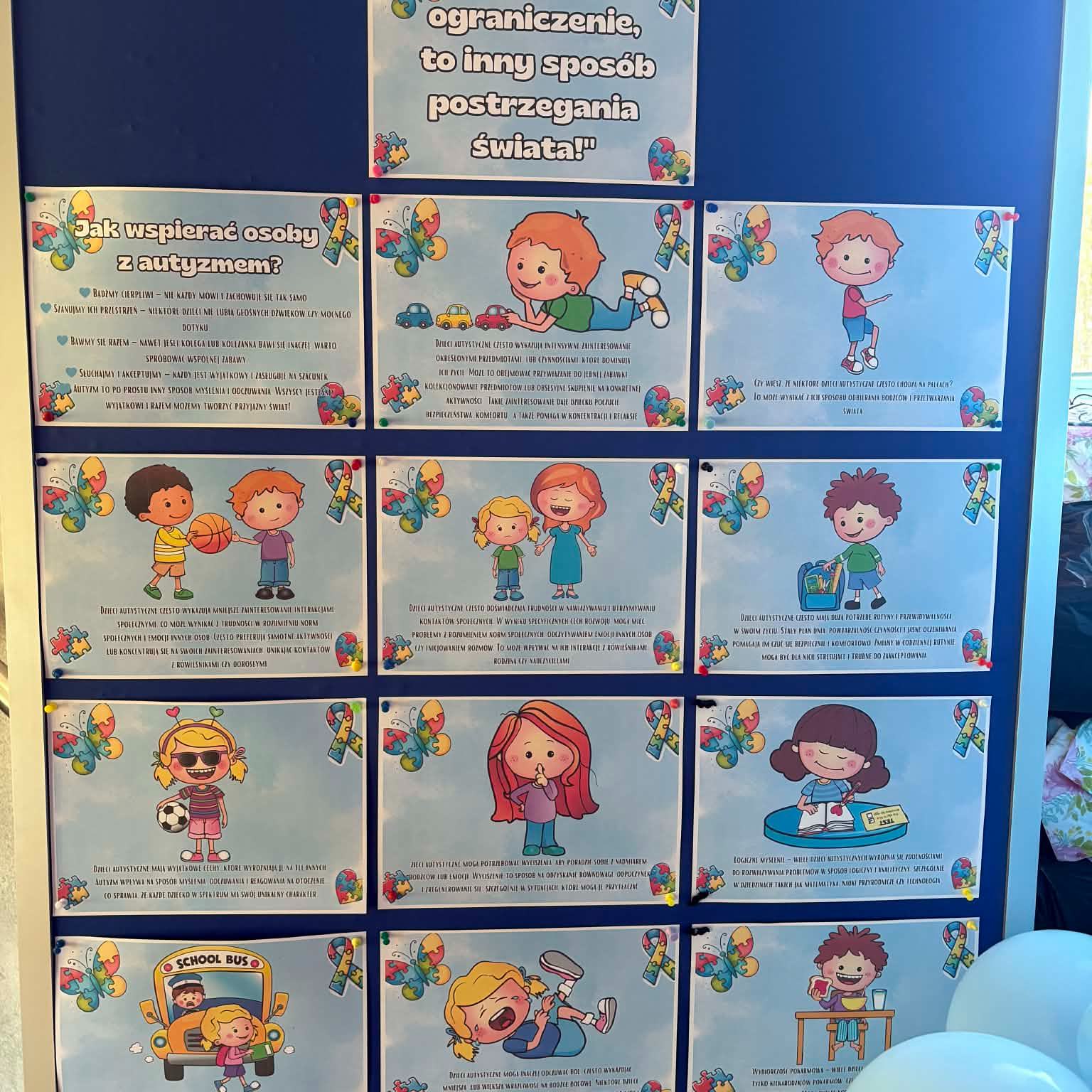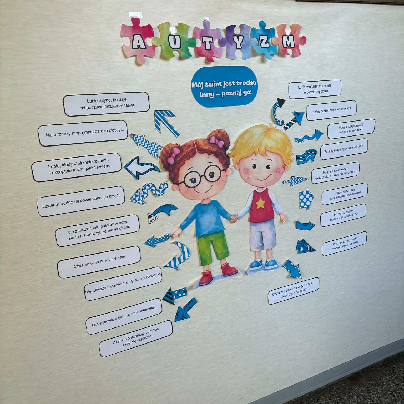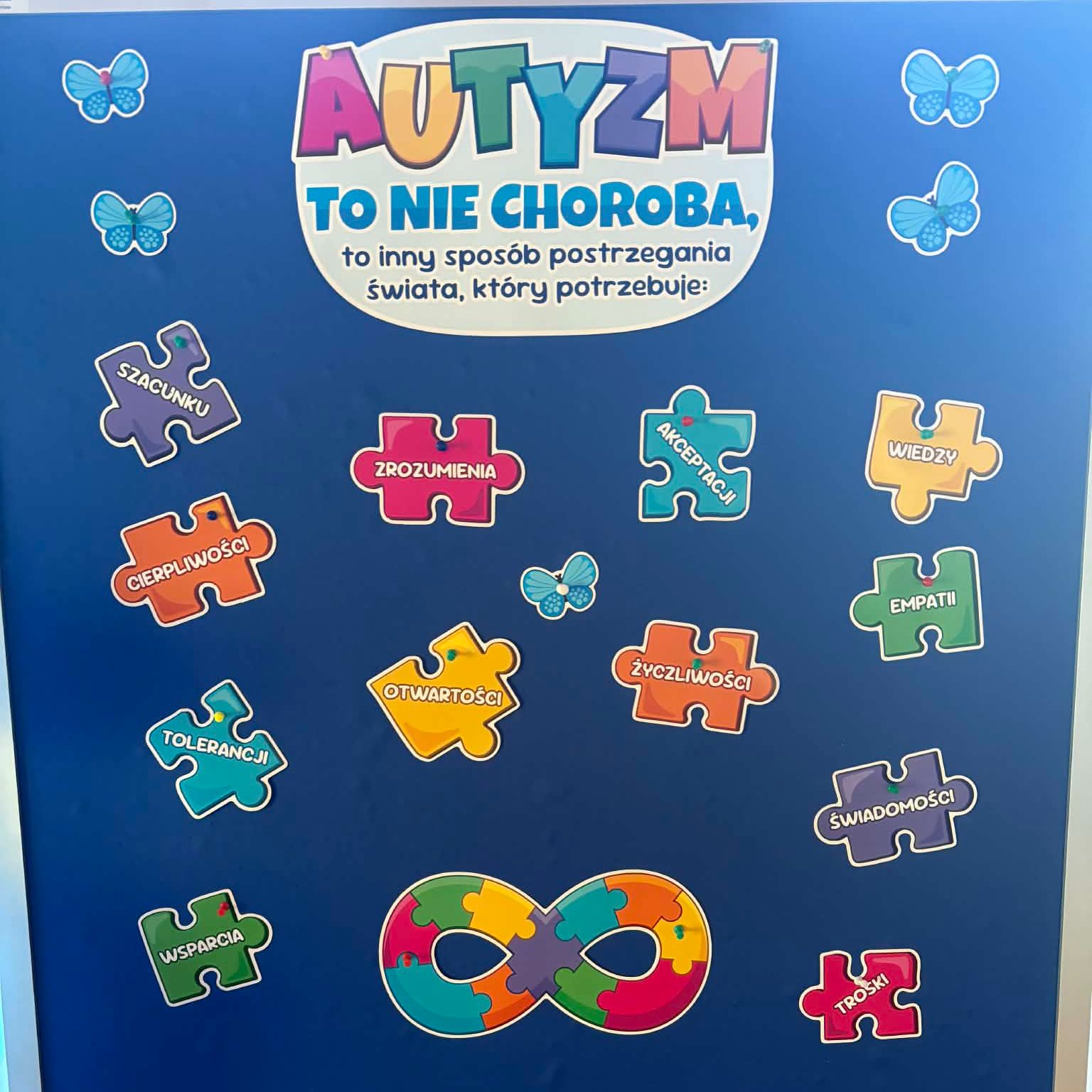 Na terenie szkoły zostały również umieszczone materiały edukacyjne dotyczące autyzmu oraz jego wczesnych objawów. Dzięki temu chcemy zwiększać świadomość nie tylko wśród uczniów, ale także całej społeczności szkolnej i odwiedzających nas gości.