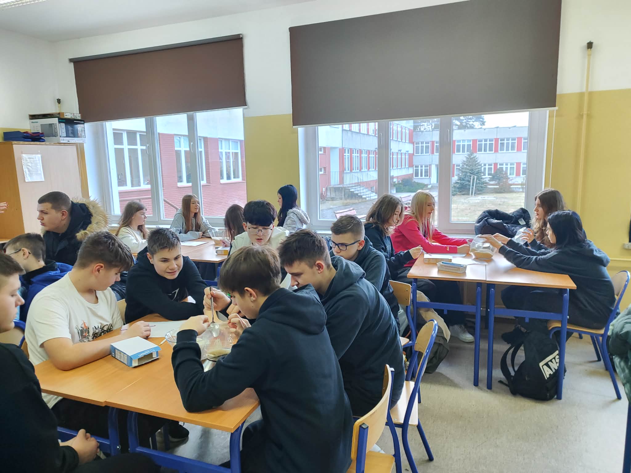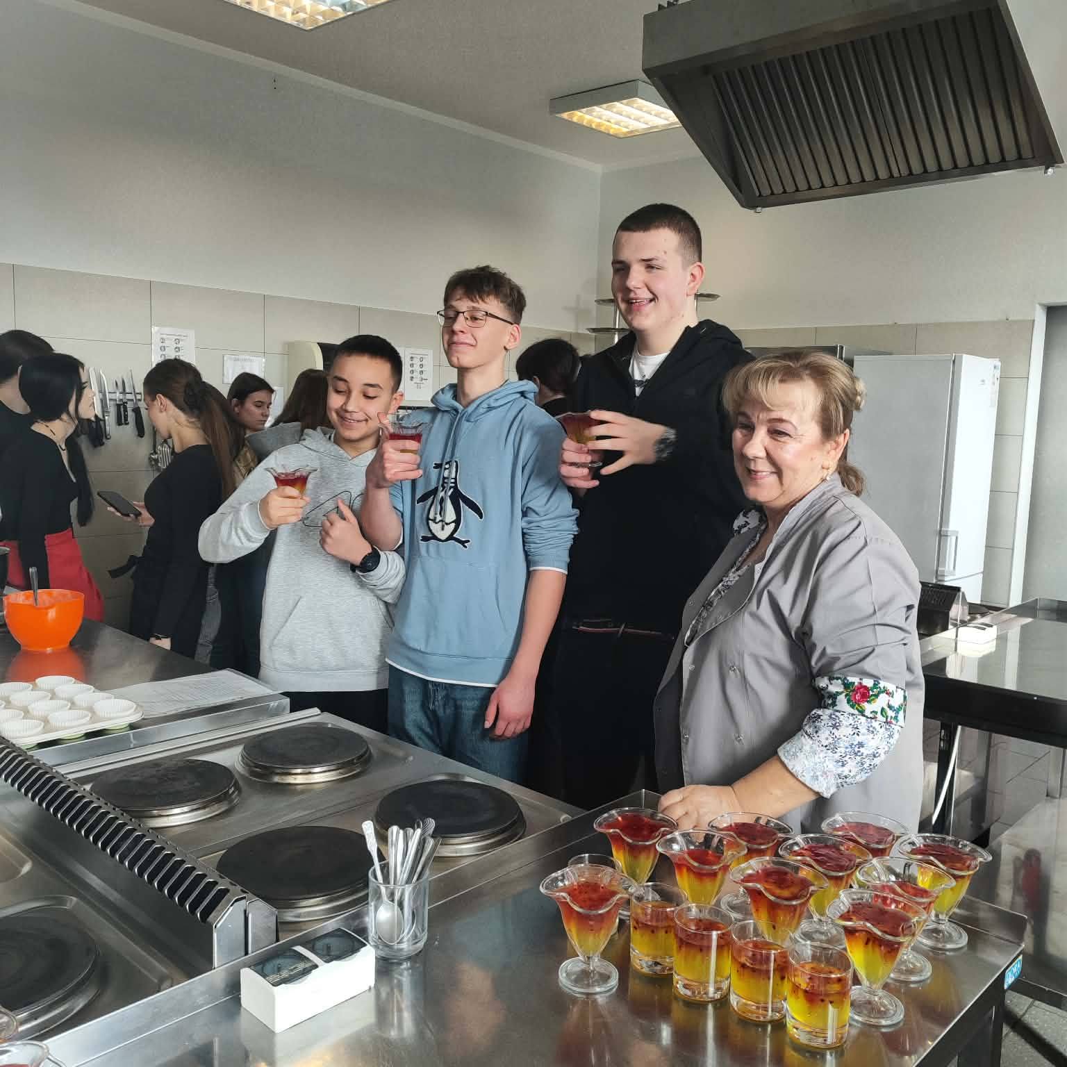 Na zakończenie uczestniczyliśmy w warsztatach kulinarnych, podczas których uczniowie dowiedzieli się, jak tworzyć efektowne przejścia kolorystyczne w deserach, a następnie samodzielnie przygotowali babeczki.