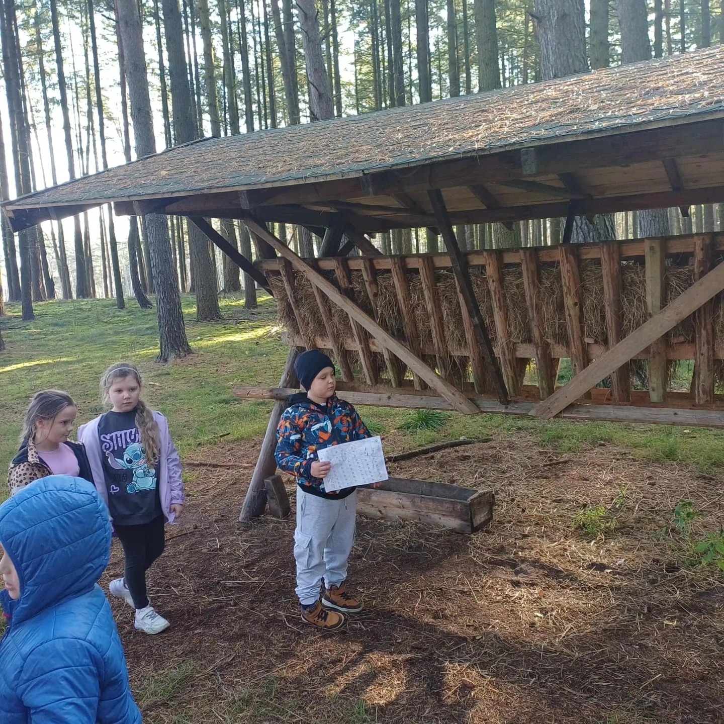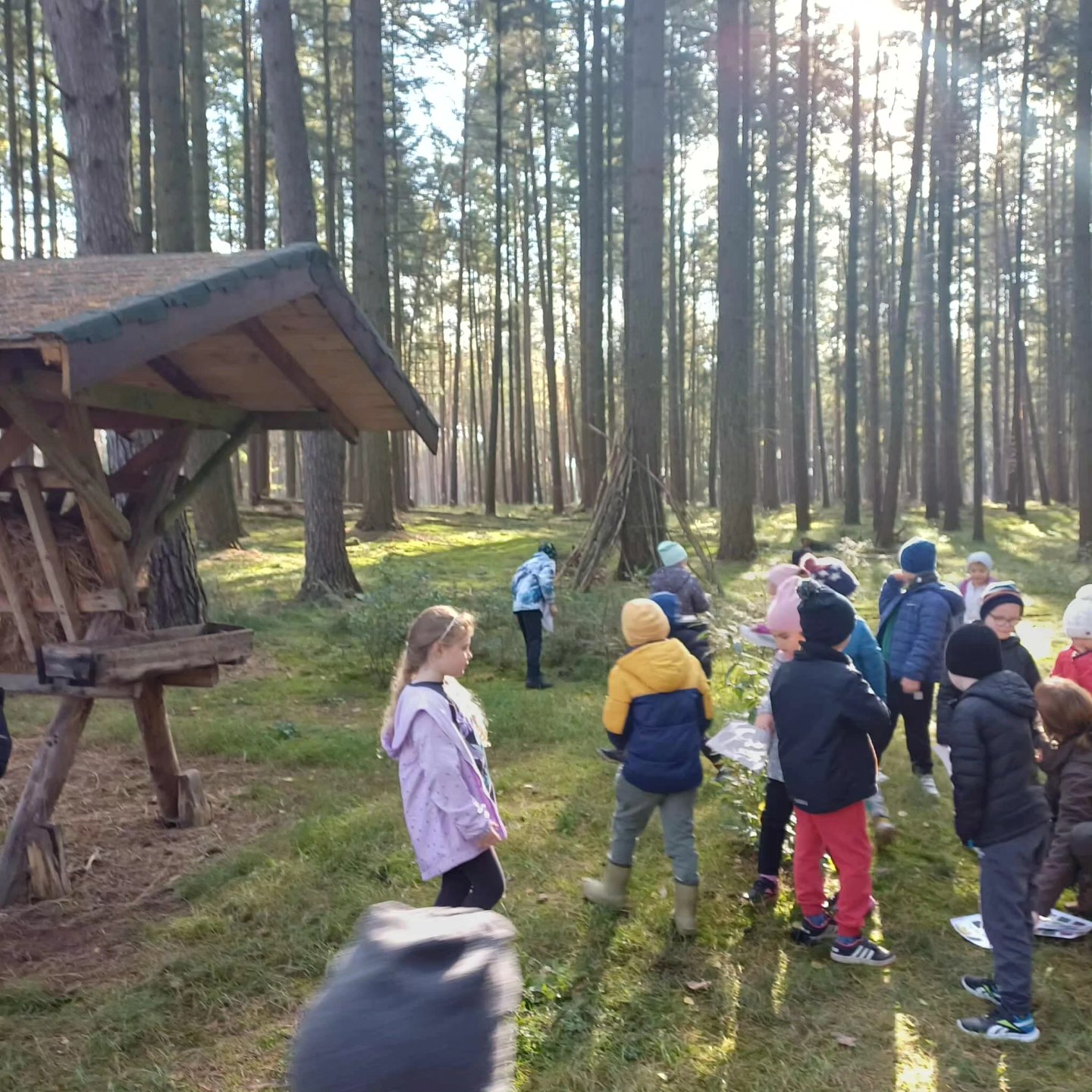 Podczas spaceru ścieżką edukacyjną z panią Moniką, leśną przewodniczką, uczniowie odkrywali las wszystkimi zmysłami: rozpoznawali jego zapachy, słuchali odgłosów i podziwiali sosnowy młodnik. Wędrówka zakończyła się przy paśniku dla zwierząt.